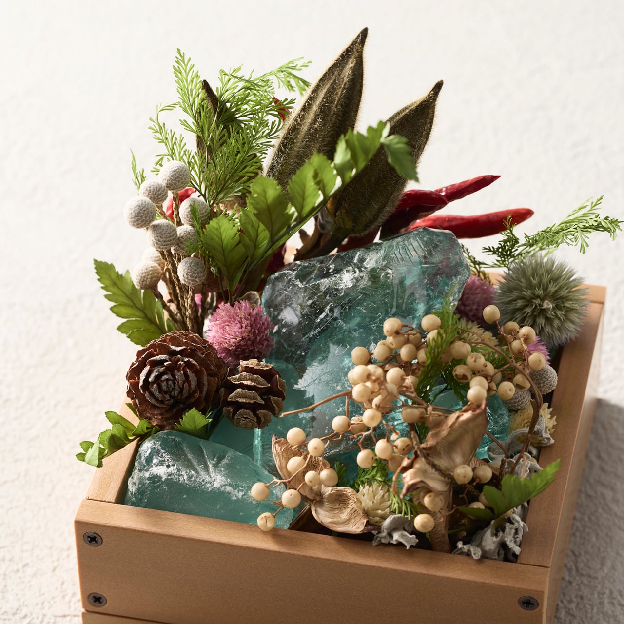 繊細なドライフラワーと光を宿すクリアなガラス素材が紡ぎ出すアートボックス。