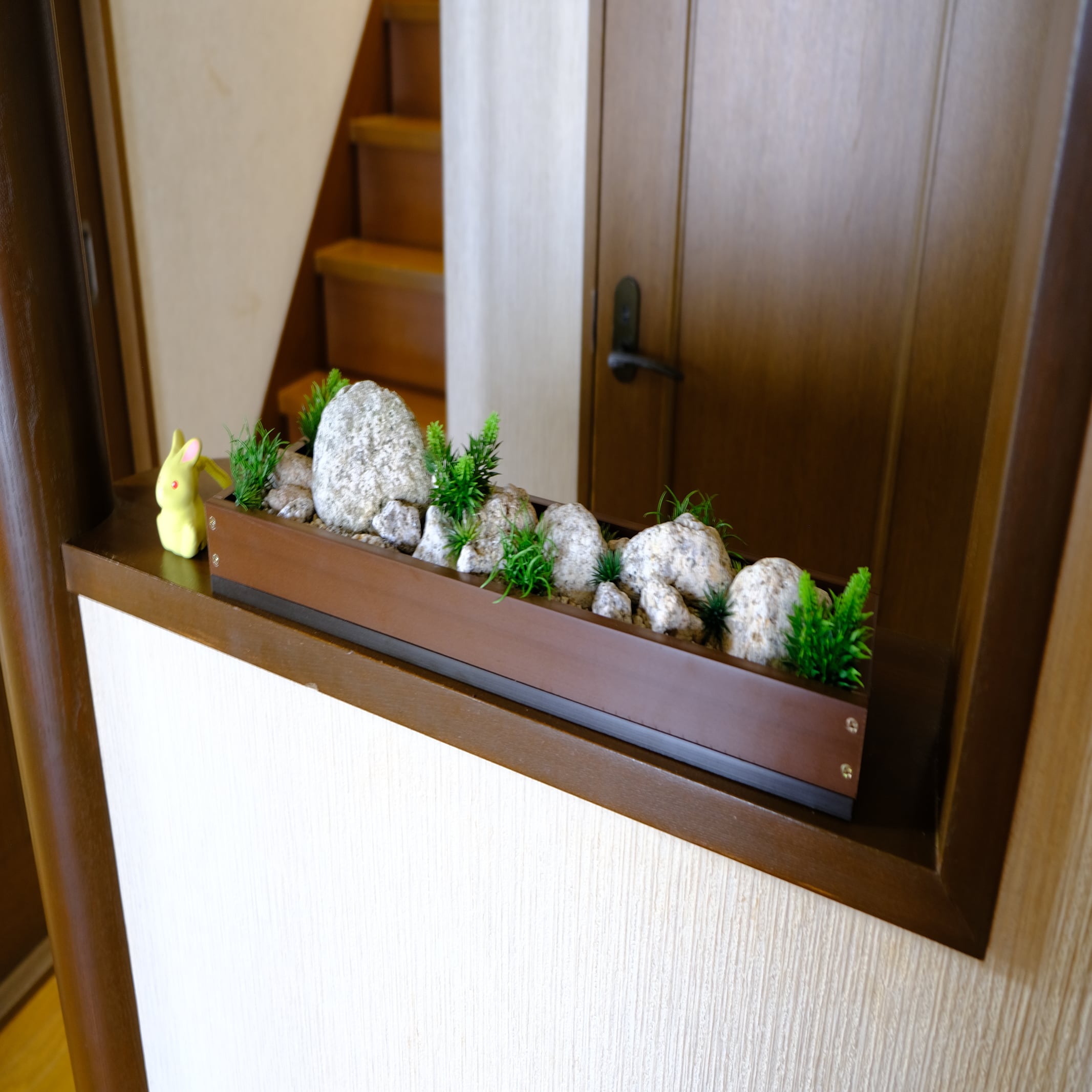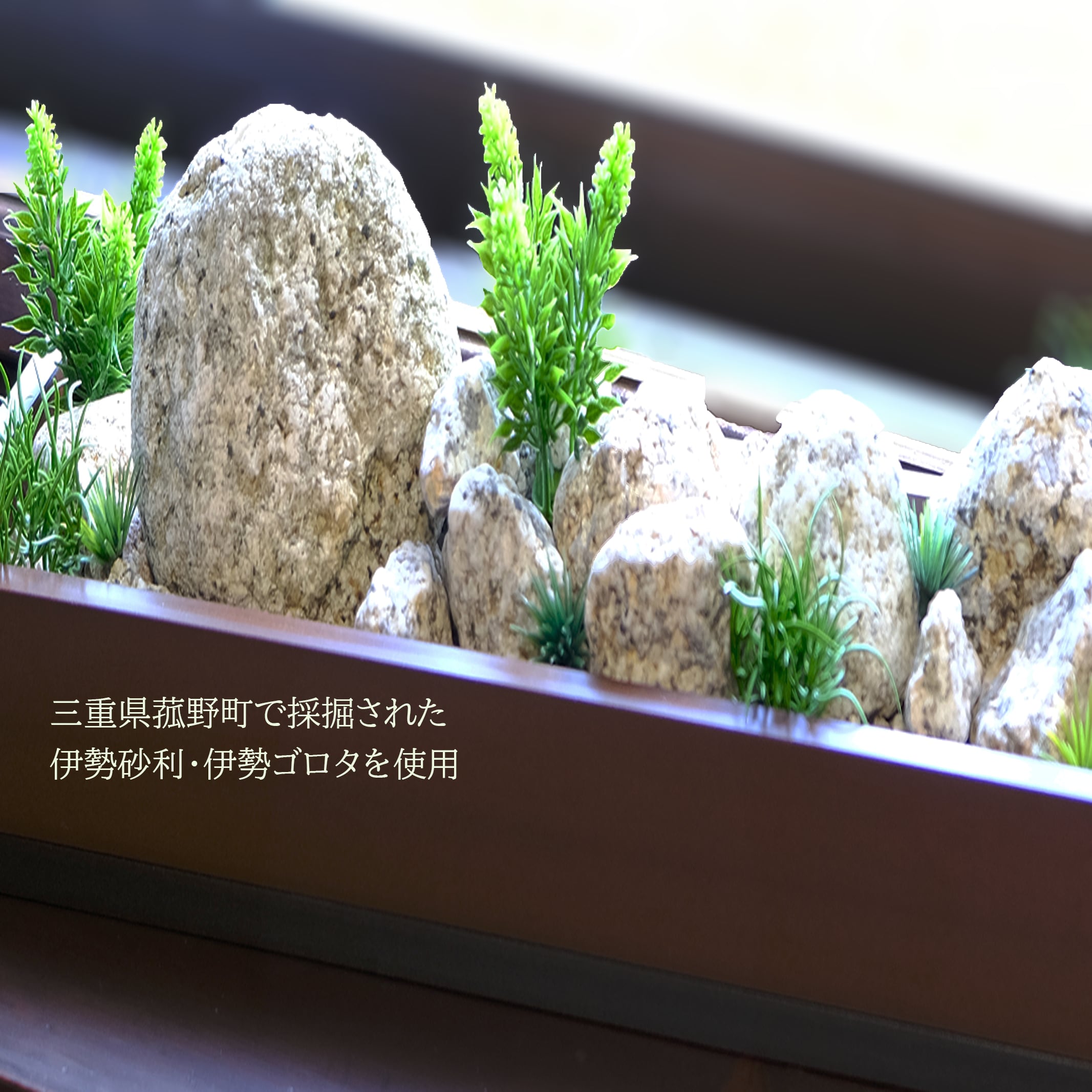 今回 伊勢砂利・伊勢ゴロタを使い神社の周囲にある神々が石に座るという意味合いの磐座(いわくら)をプラボードの箱の中に、組み合わせフェイクの緑草を盛り付けさせて頂きました。